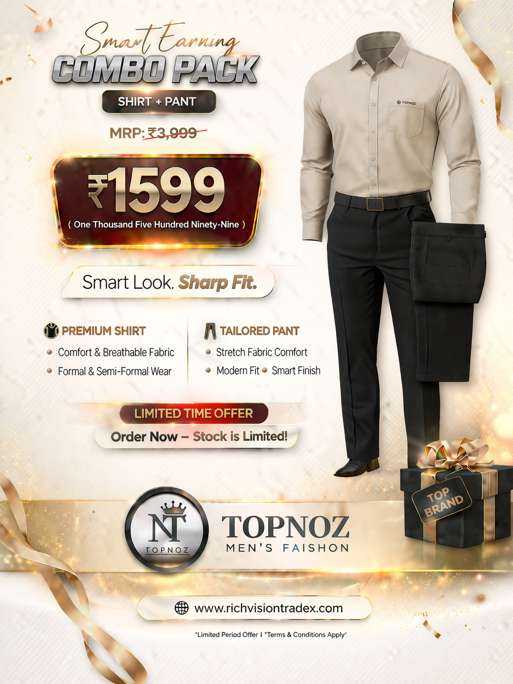 TOPNOZ Business Class Combo Pack Upgrade your style with the perfect blend of elegance and comfort. This combo features a light brown premium shirt paired with classic black tailored pants, designed for a sharp and confident look. Product Highlights: • Light Brown Shirt – Soft, breathable & skin-friendly fabric • Black Pant – Modern tailored fit with stretch comfort • Perfect for Formal & Semi-Formal Occasions • Smart Fit with a Premium Finish Step into confidence with TOPNOZ Men’s Fashion – where style meets perfection.